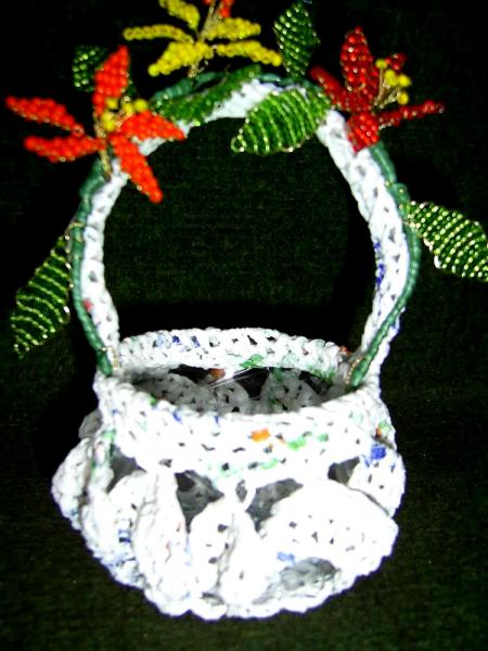 Panier crocheté avec des sachets plastiques plus fleurs en perles